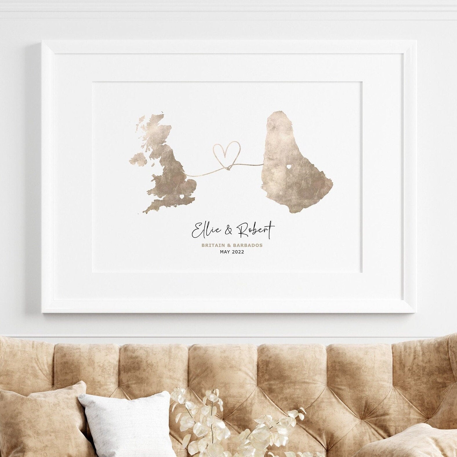 Personalised Map Print, Any 2 Countries, Wall Art Poster, Unique Gift Idea, Love Heart Location Map Print, Country to Country